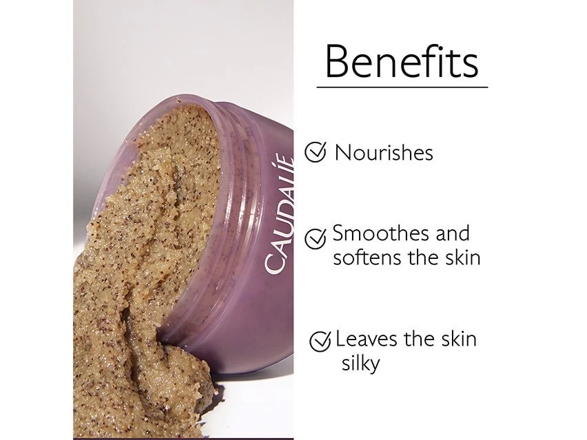 Caudalie Vinosculpt Crushed Cabernet Scrub visibly smooths, tones and firms skin with gentle exfoliation.