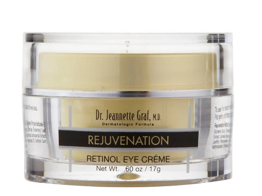 Dr. Jeannette Graf, M.D. Rejuvenation Retinol Eye Creme utilizes a soothing blend of Chamomile, Green Tea, and Rosemary, as well as a timed-release delivery of retinol to provide continuous benefits throughout the day, helping to control the visible signs of aging around the eye. The formula has been safety-tested for use around the delicate area of the eye. It has also been ophthalmologist-tested. This unique formula with retinol will help visibly improve elasticity, increase firmness and diminish the appearance of fine lines and wrinkles. And, you’ll notice improvement in skin texture, increased hydration, and softer skin.