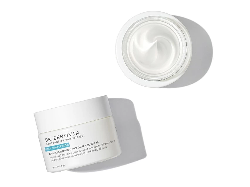 Dr. Zenovia Skincare Advanced Repair Daily Defense SPF 45 provides antioxidant-rich sun protection that helps promote clearer skin.