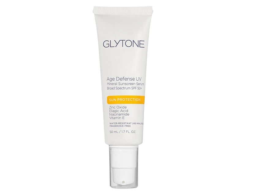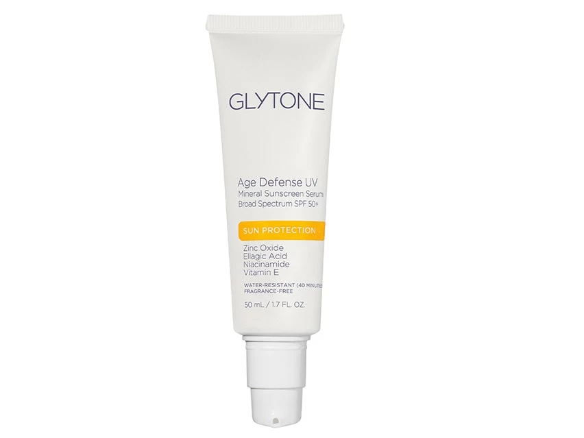 Glytone Age Defense UV Mineral Sunscreen Serum Broad Spectrum SPF 50+ protects, brightens and nourishes skin.