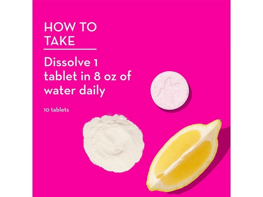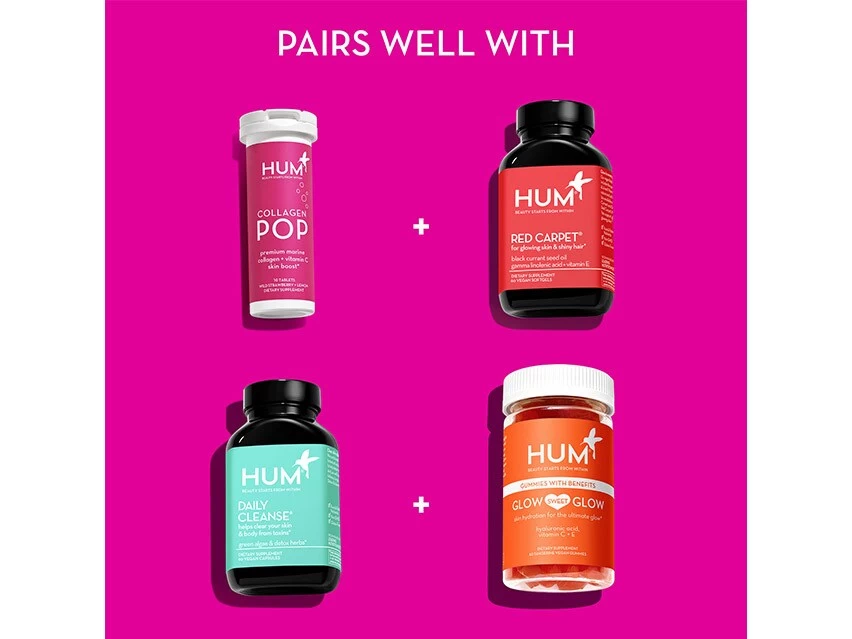 Promote hydration, elasticity and firmness using HUM Nutrition Collagen Pop + Vitamin C Dissolvable Tablets.