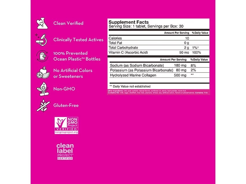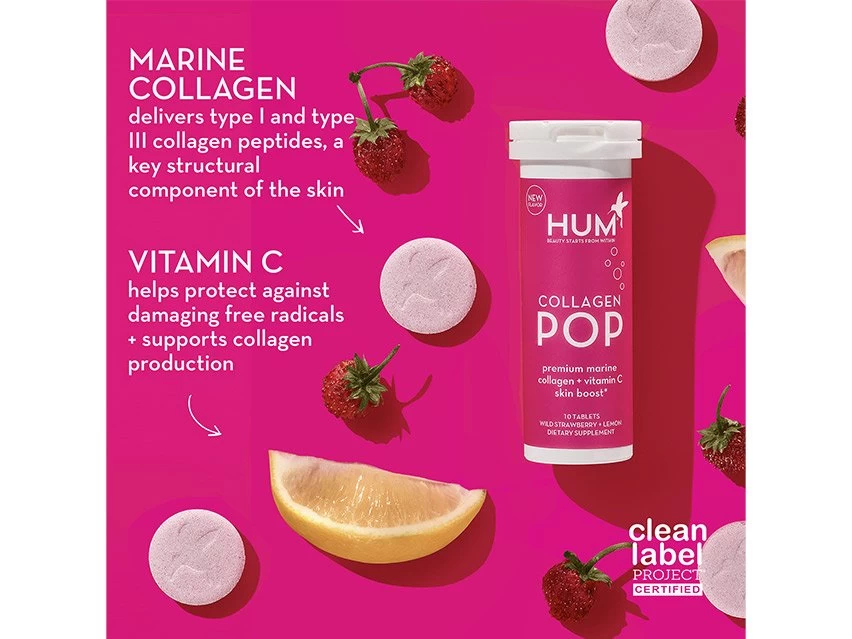 Firm and hydrate skin with the HUM Nutrition Collagen Pop + Vitamin C Dissolvable Tablets.