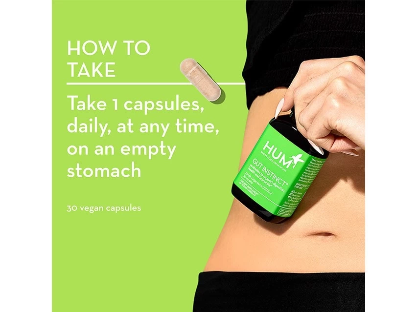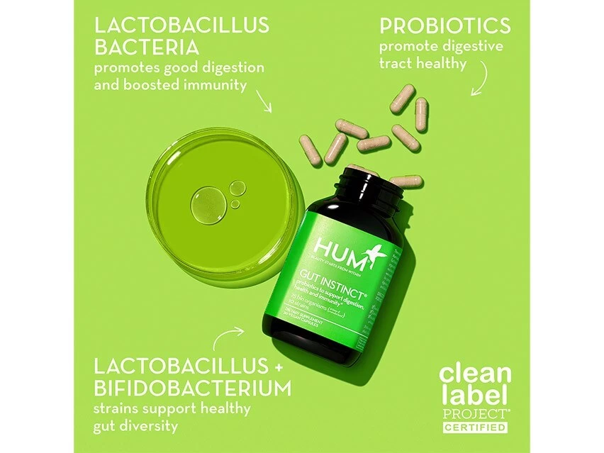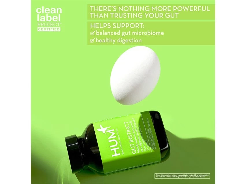 HUM Nutrition Gut Instinct supports gut health with a potent dose of vegan probiotics.