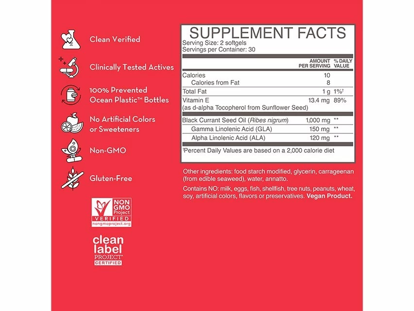 Research: The composition of blackcurrant seed oil (BCSO) corresponds to the recommended dietary intake of EFAs, and as a dietary supplement could, in small doses, modify the imbalance of EFAs in an efficient way in cases of skin conditions associated with an altered intake of EFAs. In many studies gamma linolenic acid (found in black currant seed oil) has been found to improve the clinically assessed skin condition, the objectively assessed skin roughness, and the elevated blood catecholamine concentrations.