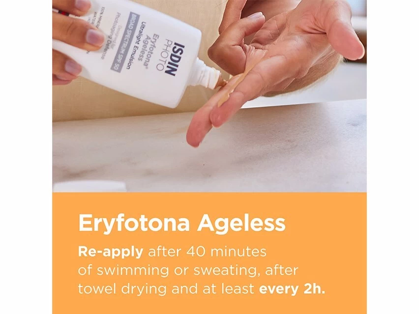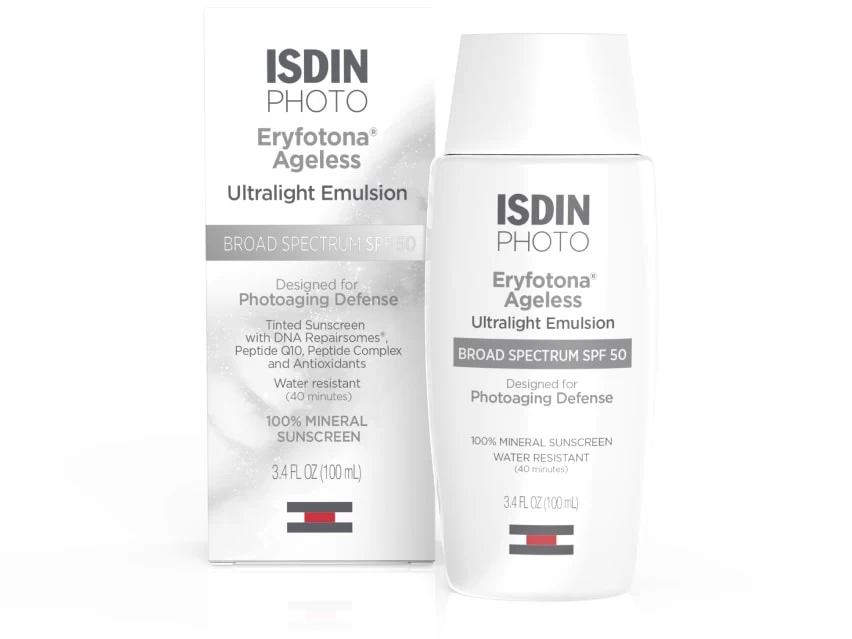 ISDIN Eryfotona Ageless Ultralight Tinted Mineral SPF 50 Sunscreen defends skin against sun damage while addressing fine lines and wrinkles.