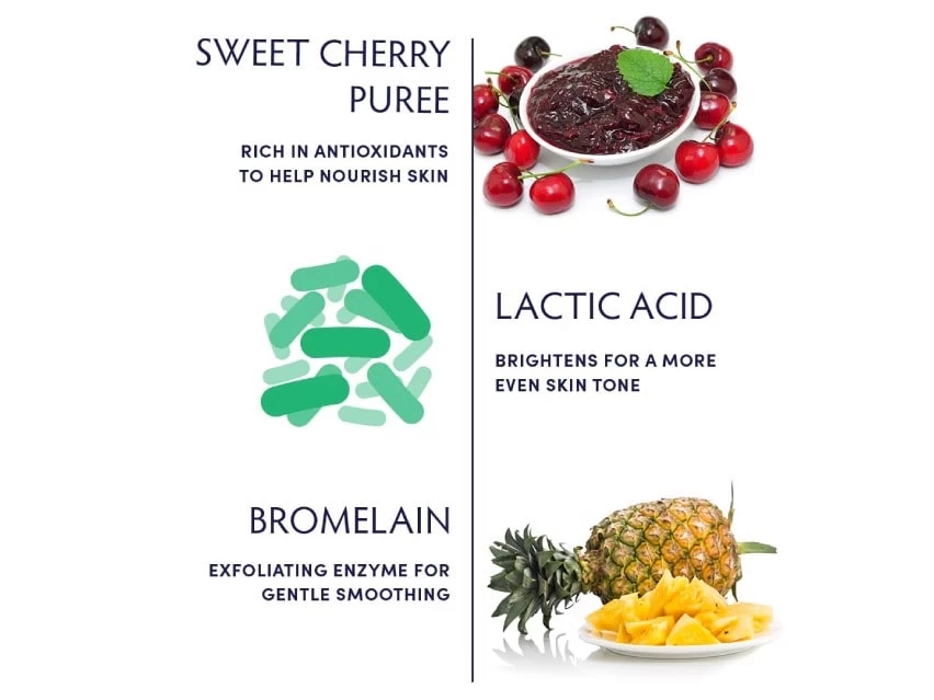 This peel brings together natural ingredients to exfoliate and replenish skin. Sweet cherry puree provides antioxidants and vitamins that nourish skin while defending it against damaging environmental stress. Lactic acid and an enzyme from pineapple exfoliate to encourage a more even skin tone and smooth skin texture.