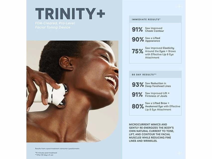 This kit includes everything you need to start lifting and tightening skin around your face. The TRINITY+ device uses microcurrents to energize muscles and promote a firmer appearance. The included Lip & Eye Attachment has a small treatment wand that delivers microcurrent to tight areas around your mouth and lips, giving your more complete toning coverage.