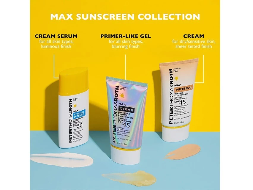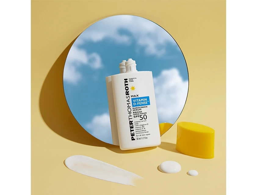 Peter Thomas Roth Max Vitamin D-Fense Sunscreen Serum Broad Spectrum SPF 50 offers hydration, antioxidant protection and sun defense.