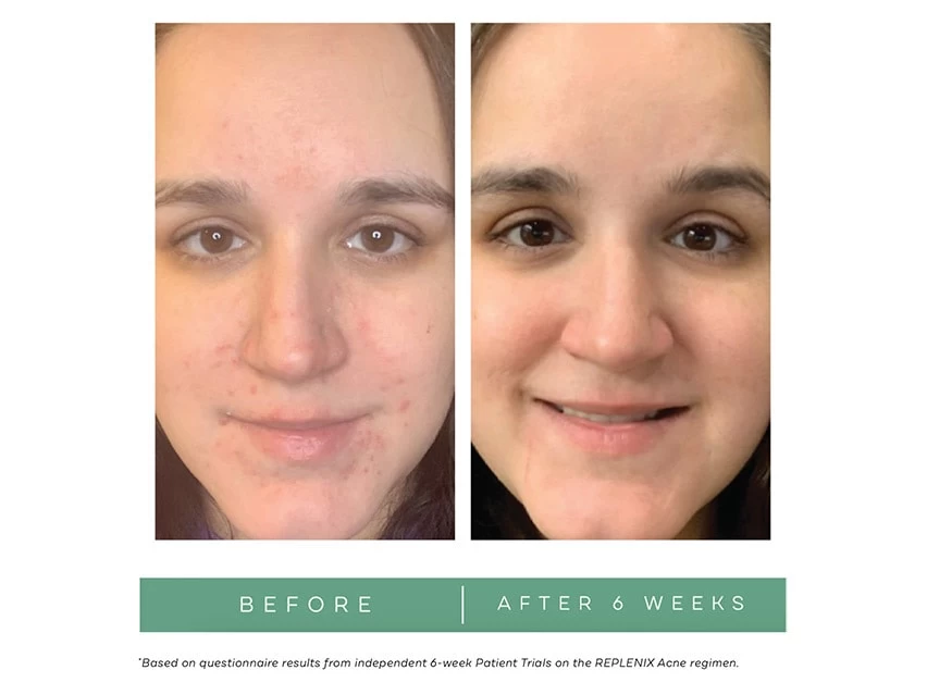 Consumer perception results of a 6-week patient trial using the Replenix Acne Regimen, which includes BP 5% Cleanser, Gly-Sal 5-2 Pads, 10% BP Spot Treatment and Oil Free Balancing Moisturizer: