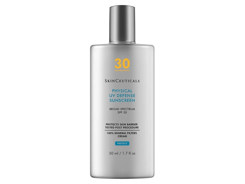 Formulated specifically as a delicate care option for post-procedure, sensitive and dry skin types, SkinCeuticals Physical UV Defense Sunscreen SPF 30 helps encourage healing while keeping skin protected against harmful UVA and UVB rays. The weightless lotion uses 5% titanium dioxide and 4% zinc oxide to create a physical barrier on skin. Plankton extract helps to stimulate the skin’s natural defenses against environmental stressors. With its nourishing, comforting texture, this sunscreen helps lock in moisture and calm irritation.