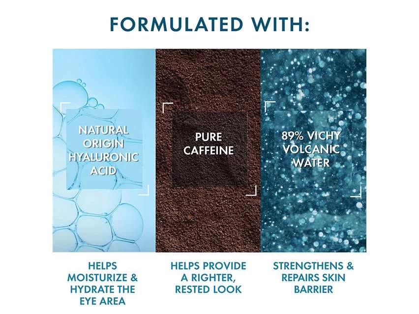 Aqualia Thermal Awakening Eye Balm is a refreshingly lightweight eye gel that delivers lasting hydration of moisturizing balm for a more radiant, refreshed appearance that lasts. Treats the appearance of under-eye puffiness and dark circles. Containing Pure Caffeine, this formula helps to counteract signs of fatigue, including dark circles, puffiness and bags. With advanced Dynamic Hydration technology to help distribute & lock water in. Formulated with Hyaluronic Acid and Aquabioryl™ known to replenish the skin with water and form a protective film. Contains fortifying and soothing Vichy Thermal Spa Water. Over the course of a day, eyes reveal signs of tiredness and wear in different ways: puffy, swollen eyes in the morning may be followed by sunken, tired-looking eyes by evening. These fluctuations are a result of uneven water distribution around the eye area.