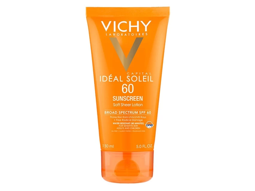 Vichy Capital Soleil Soft Sheer Sunscreen SPF 60 provides broad-spectrum UVA + UVB protection and fights skin-aging free radicals. It contains a unique combination of effective UV filters and powerful antioxidants (Vitamin E and White Grape Polyphenol) to help protect your skin at the cellular level* to keep it looking healthy and beautiful. This non-greasy, lightweight formula for sensitive skin is safe for children, allergy-tested, fragrance-free and water-resistant. It is absorbed quickly and does not leave skin feeling sticky or greasy.