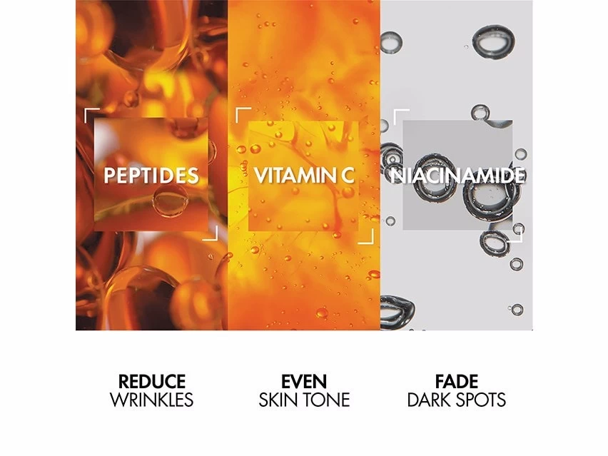 - Vitamin C provides antioxidant protection while brightening, reducing visible signs of aging and defending against skin stress