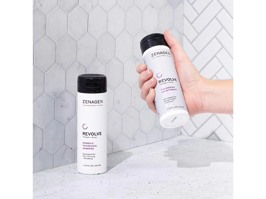 Zenagen Revolve Thickening Conditioner promotes thicker fuller hair.
